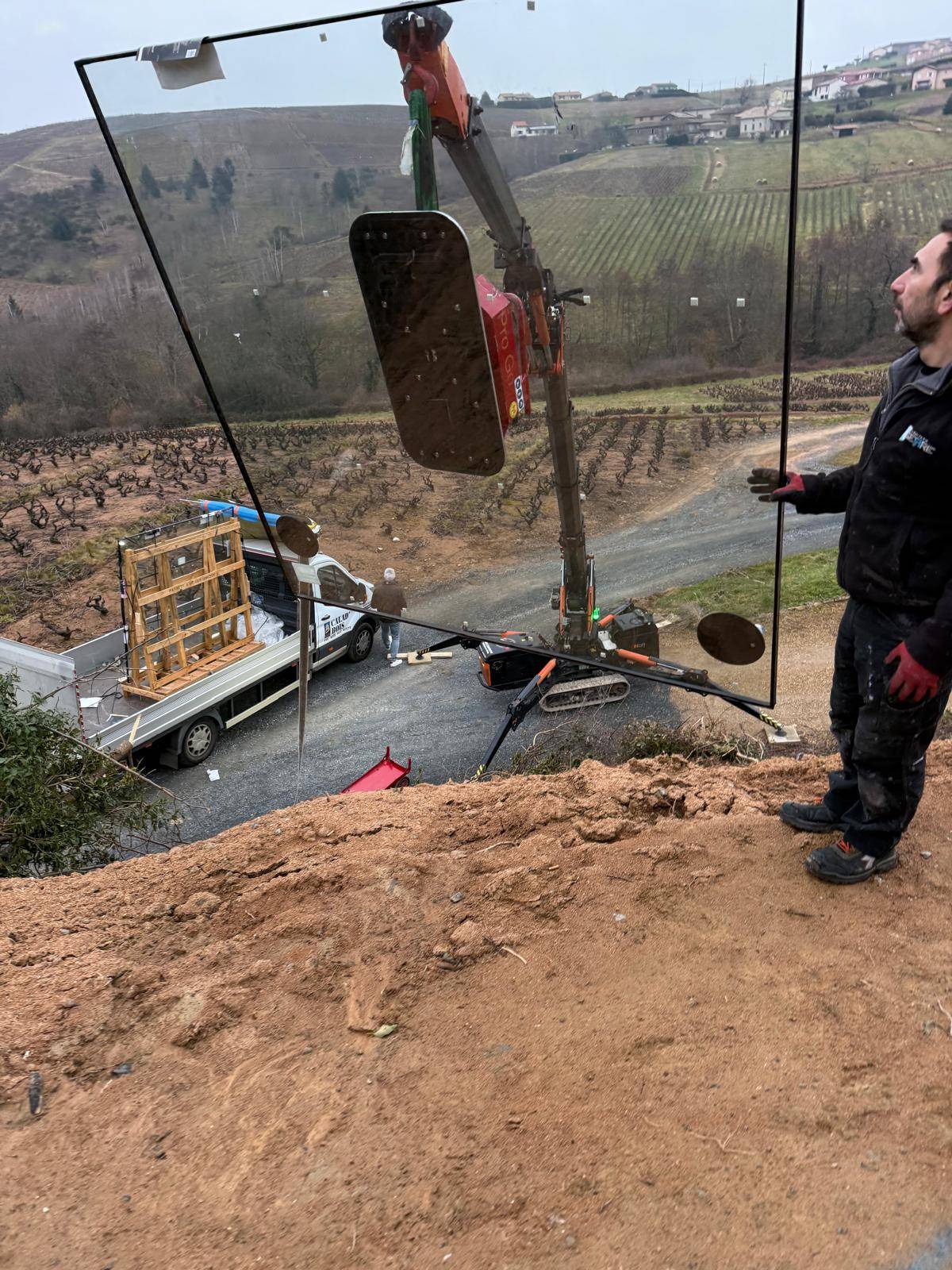 Le chantier se situait sur une maison construite sur une butte de terre, ce qui compliquait l'accès et rendait l'intervention particulièrement délicate. Grâce à la grue araignée BG Lift M250, nous avons pu effectuer le levage et la mise en place des vitrages rapidement et en toute sécurité.