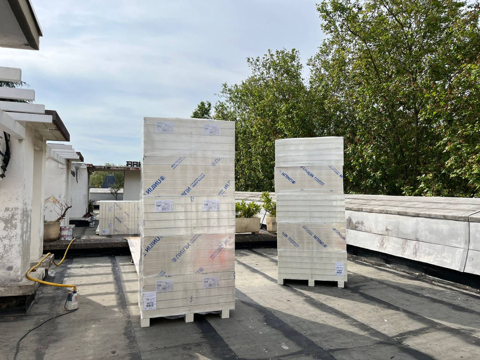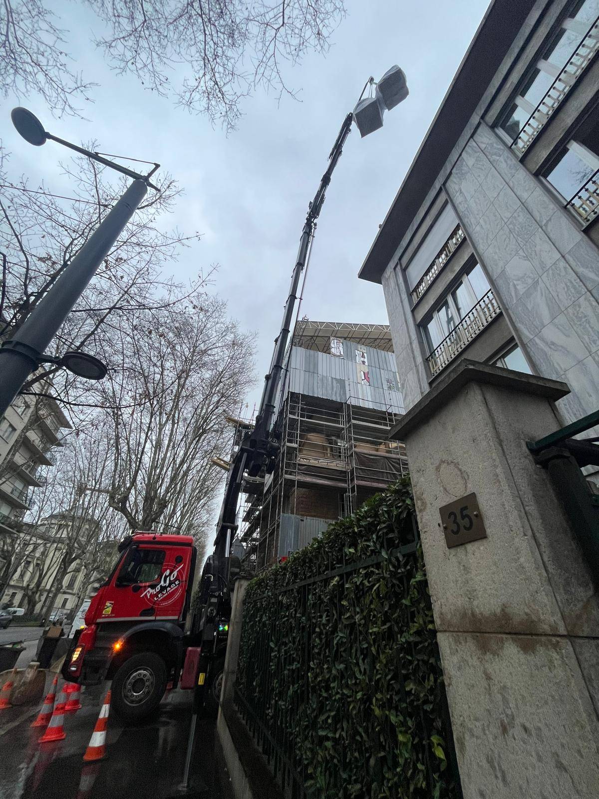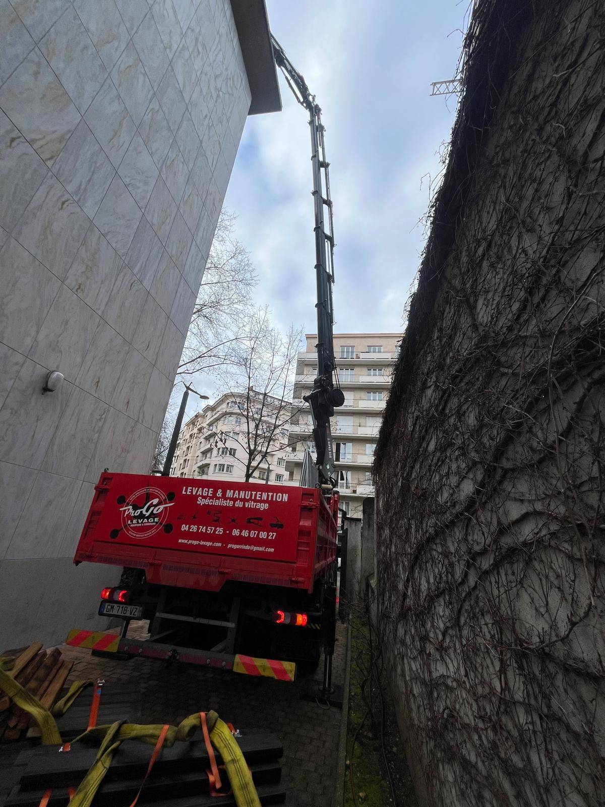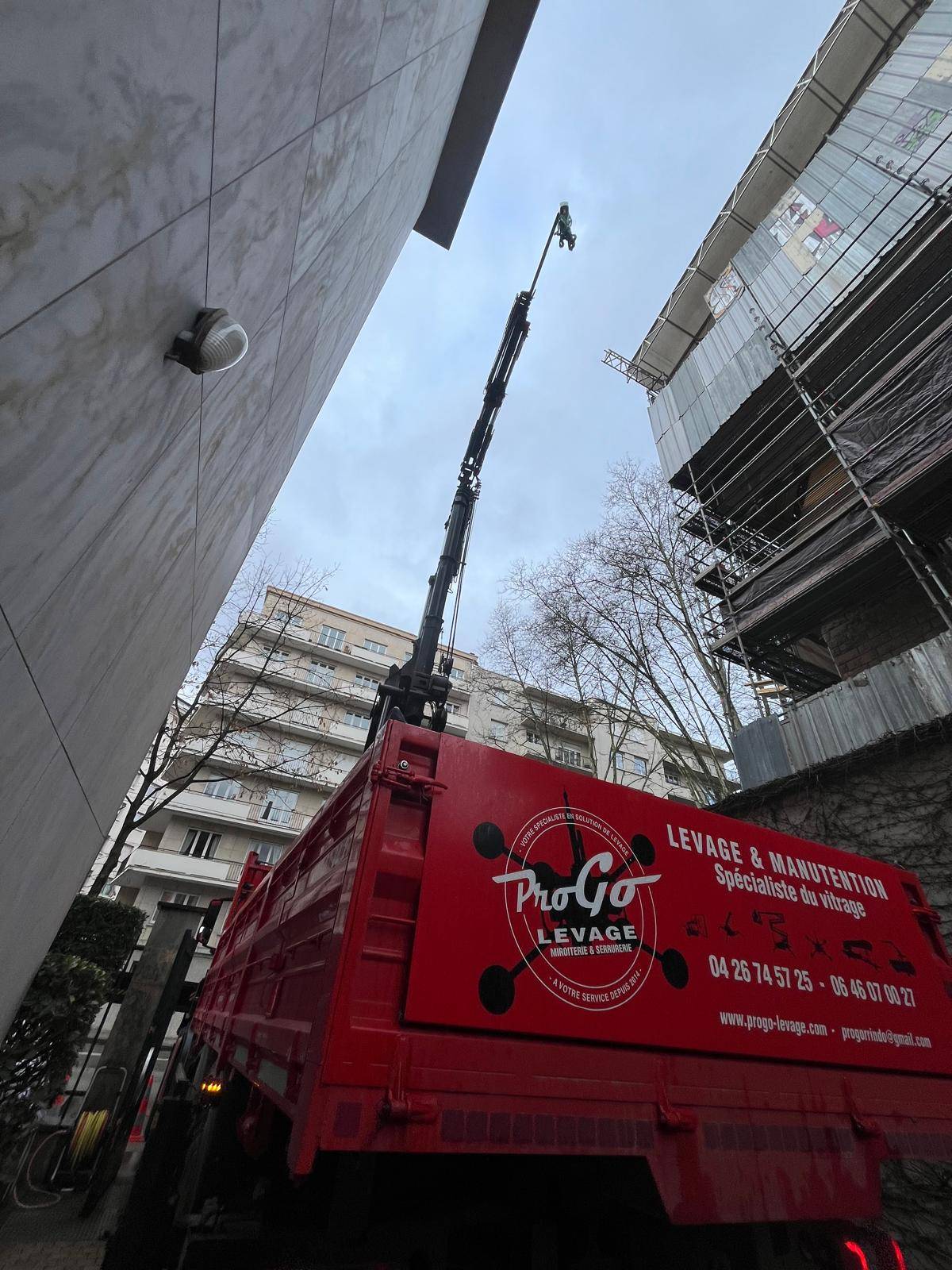 Approvisionnement de palettes et big bag en toiture pour une entreprise d'étanchéité. Accès exigüe en plein coeur de Lyon, entre deux bâtiments avec passage de câbles électriques. Notre grutier a calé le camion au millimètre près afin de réaliser cette opération efficacement et en toute sécurité.