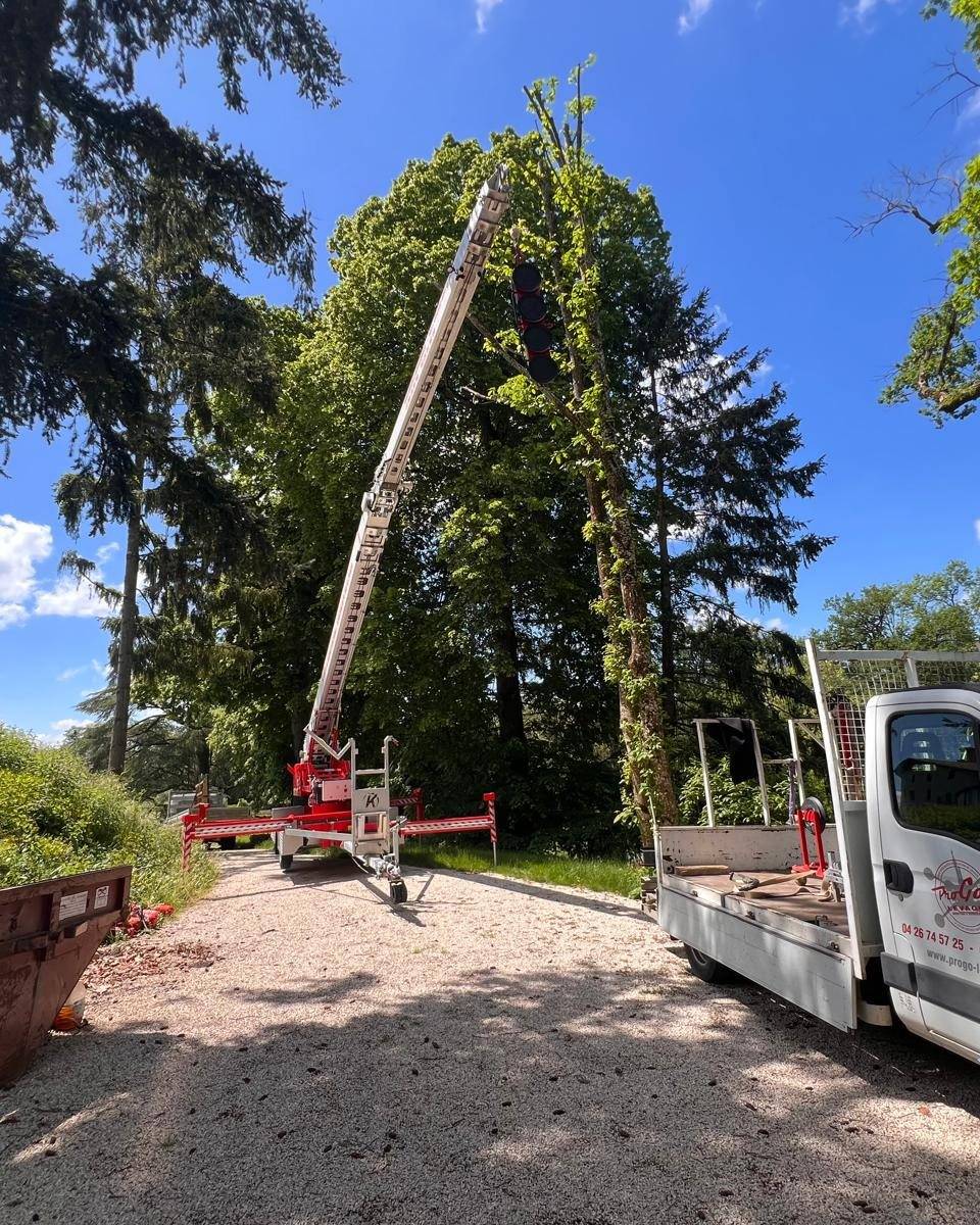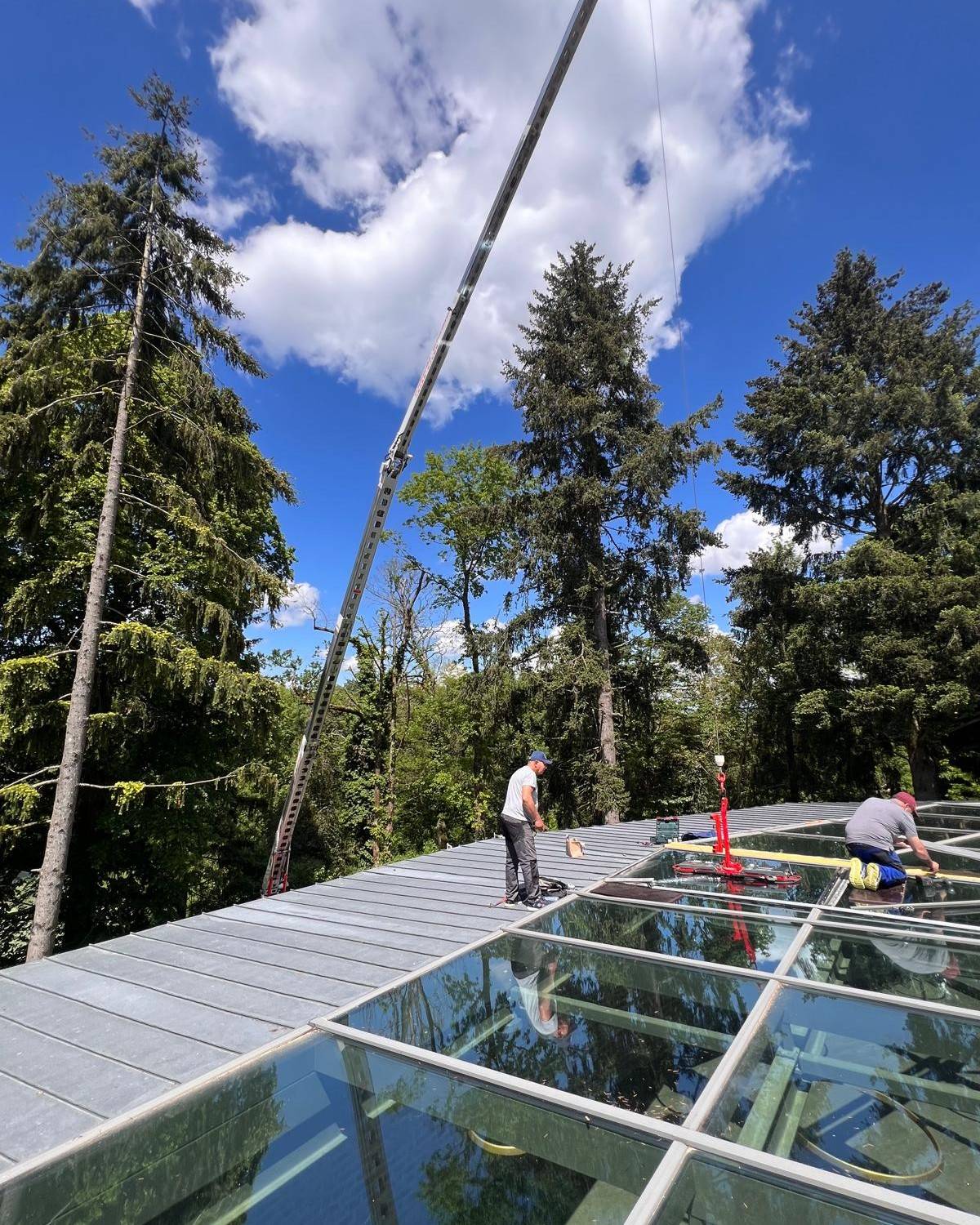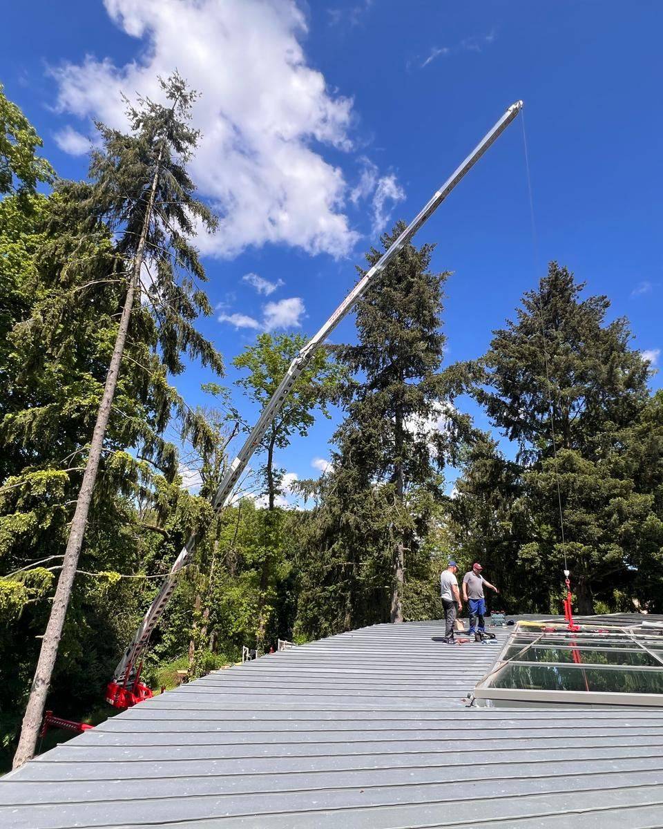 Notre client nous a sollicité pour un grutage suite au remplacement d'un vitrage, endommagé suite à une chute d'arbre, sur une verrière d'une salle de réception, à Versailleux dans l'Ain.