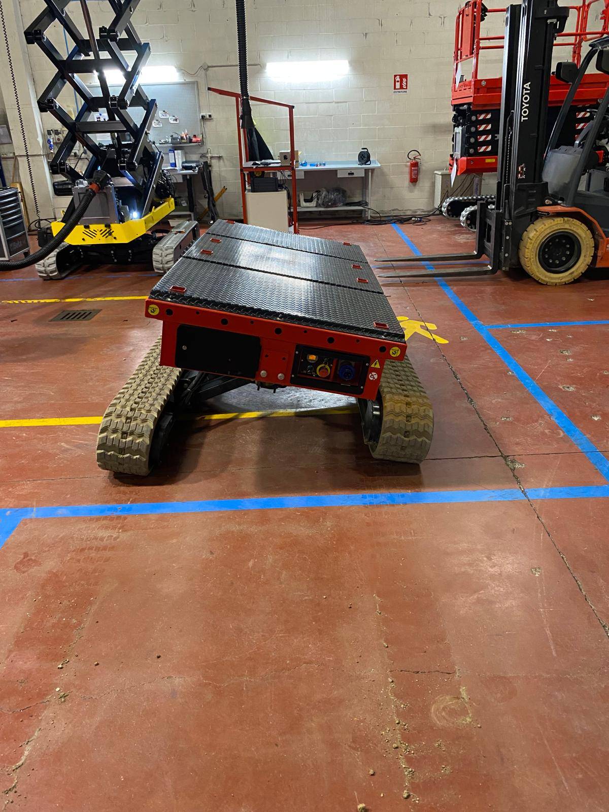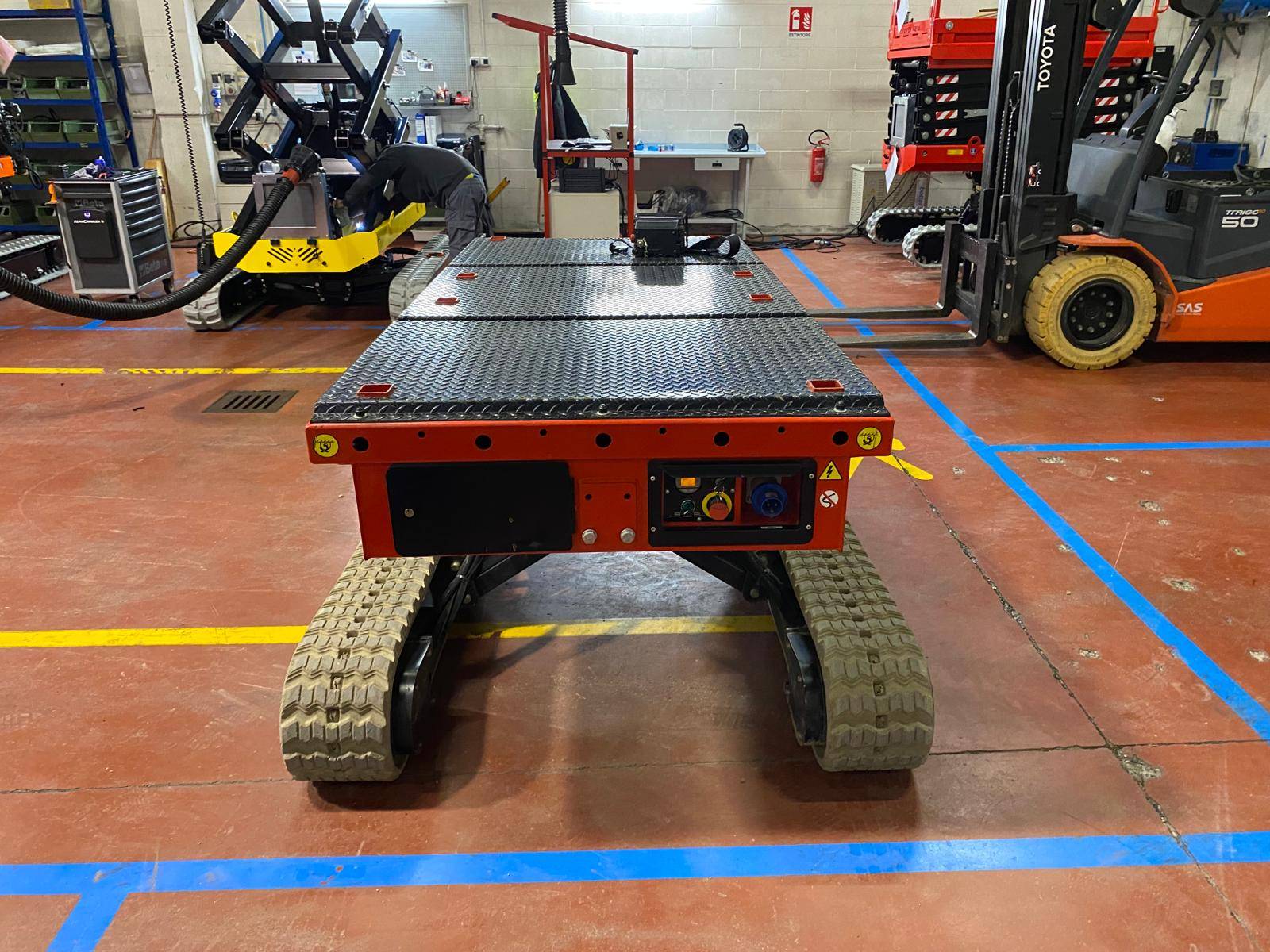 Notre transporteur sur chenilles ALMAC avec technologie breveté à 2 niveaux. Entièrement électrique et radiocommandé.