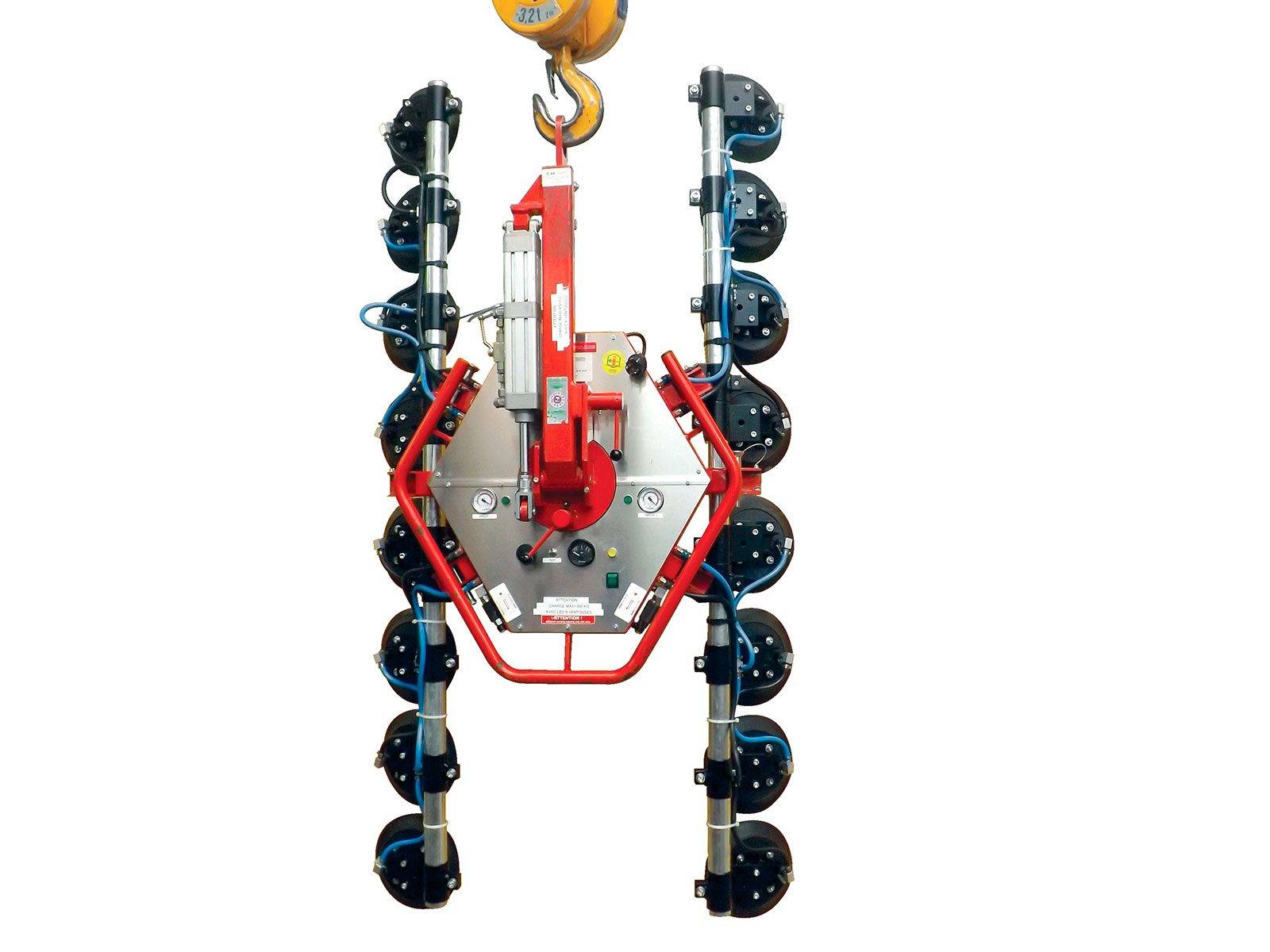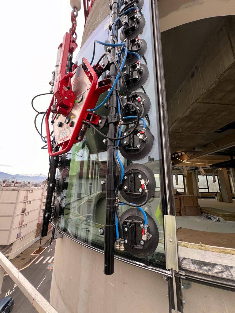 Equipé de rallonges pour verre convexe ou concave, il permet la manutention de verre bombé jusqu'à un rayon de 800mm.