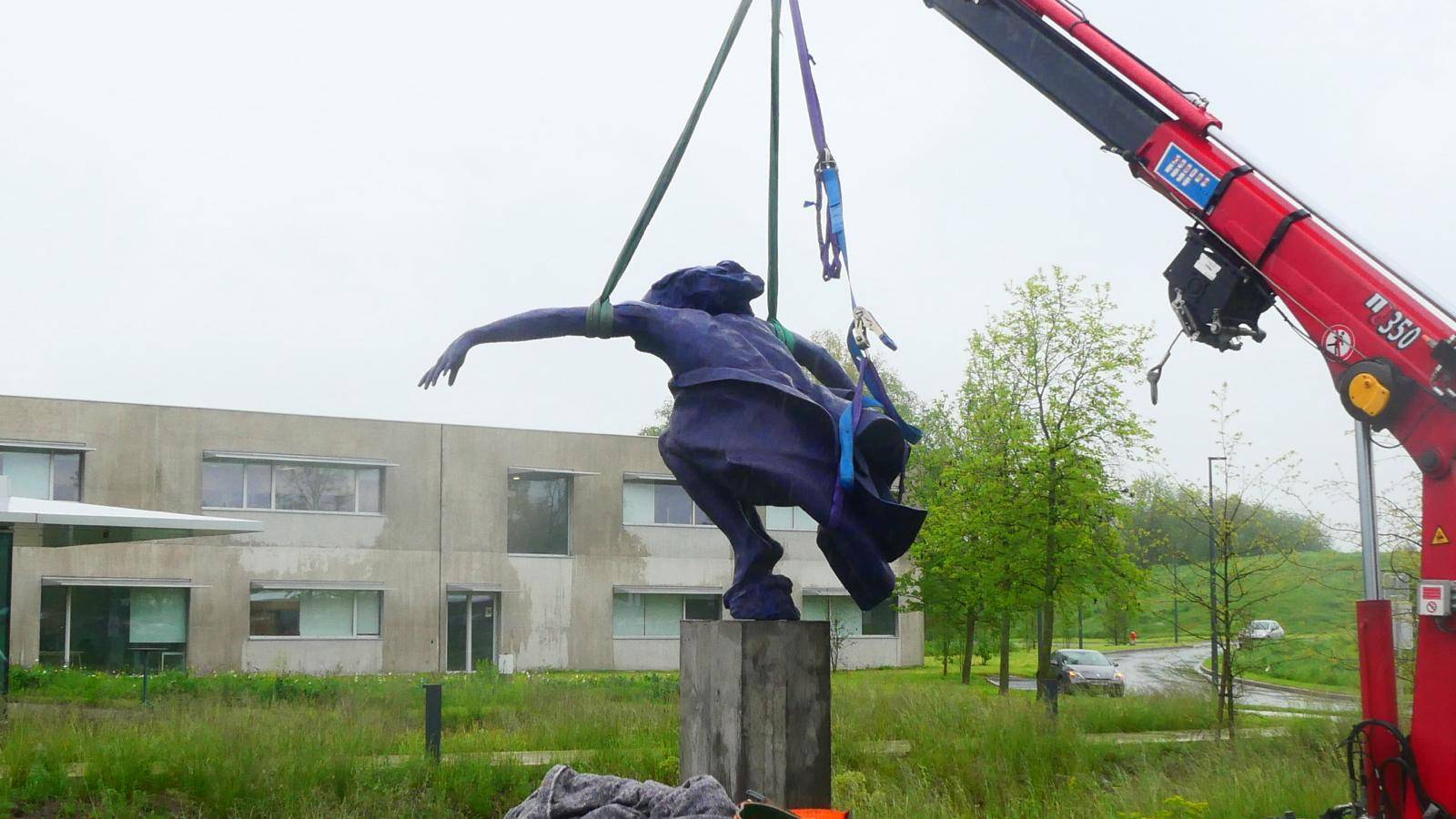 Utilisation de notre mini grue araignée Kegiom 350 pour la pose de cette sculpture en bronze et de son socle.